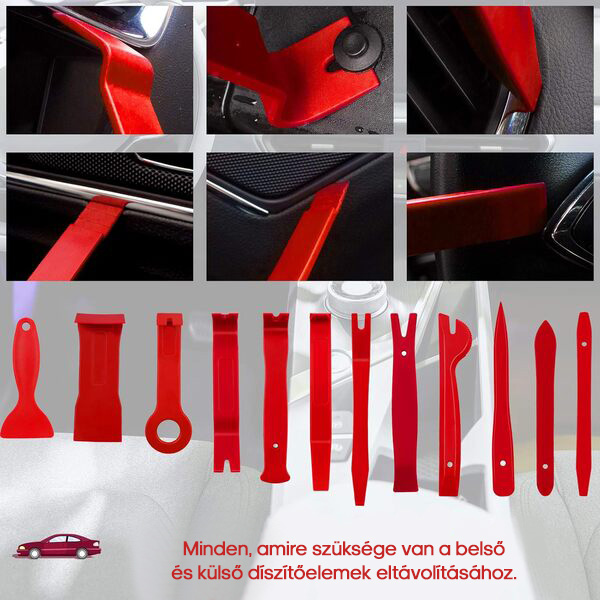 A készletben levő szerszámok: 38 darab (kárpit eltávolító szerszámok, klipsz eltávolító fogó, kaparó szerszám, kárpitos rögzítők eltávolítói, precíziós kampószedők, sztereó eltávolító szerszámok, autó csatlakozók).